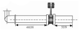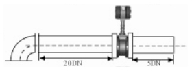 3、彎管的安裝 如果流量計(jì)的前端有90°彎頭或T型接頭,要保證流量計(jì)的前直管段≥15D,后直管段≥5D |