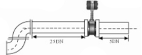 5、不同平面兩個(gè)彎管的安裝 如果流量計(jì)的前端有兩個(gè)90°彎頭,要保證流量計(jì)的前直管段≥25D,后直管段≥5D |